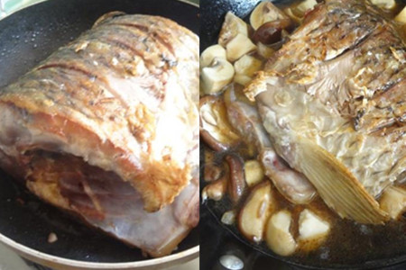 取一口平底不粘锅,放在灶上,开火烧热,放入腌好的鲤鱼段煎制,把鲤鱼段煎成金黄色后盛出锅备用。炒锅上灶,注入适量油,烧热,下肥肉片和大料炒香。接着倒入葱姜蒜,一起煸炒。炒出香味后,放入香菇和草菇翻炒,再把煎好的鲤鱼也下锅,倒入适量清水,烹入适量酱油和盐,加盖,调至大火烧开后转小火焖煮至汤汁收干。