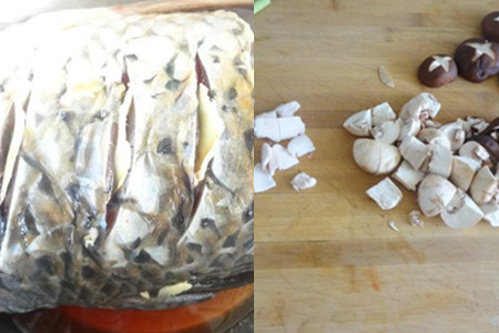 在鲤鱼段上划上几刀,抹上一些食盐,塞入几块姜片,鱼腹内也放几片姜片,再淋上一些料酒,用手抹匀,腌制一个小时。香菇和草菇清洗干净,香菇打上花刀,草菇对半切开,葱姜洗好切碎,大蒜去皮切碎,肥肉洗干净切片。