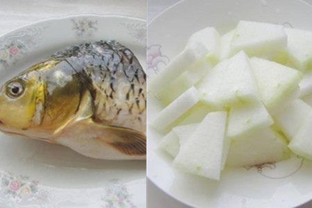 把鲤鱼的鱼鳞、鱼鳃和内脏去掉,冲洗干净,将鱼身切掉,鱼头用适量料酒和盐,腌制片刻。冬瓜洗干净削皮,切成小块备用。香葱洗干净挽成结,生姜洗干净切成片,香菜洗干净切成末。