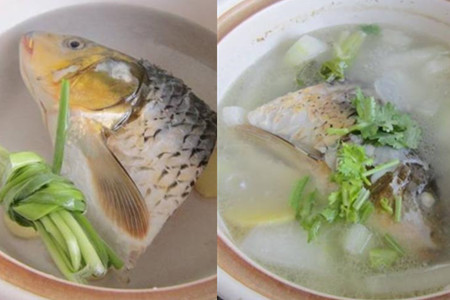 取一口砂锅,注入适量清水,放入鲤鱼头、葱结、姜片,烹入适量料酒,开大火烧开。烧开之后,撒入适量白砂糖,调至小火炖二十分钟左右。二十分钟后,放入冬瓜块,调入适量食盐,继续小火炖煮,直到把冬瓜煮熟透。冬瓜煮熟之后,撒上香菜末即可关火。炖煮鲤鱼一定要用小火慢炖。