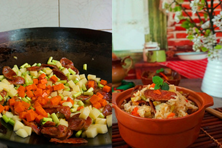 先将佐料放入锅中一同翻炒,然后加入香肠。香肠中本来就有很多油脂,经过翻炒,油脂溢出,会让米饭更香。在这里,我们可以加入自己喜欢的蔬菜,例如土豆或者胡萝卜。然后加入米饭和水,一同焖煮即可。【女物原创未经允许,谢绝转载!】