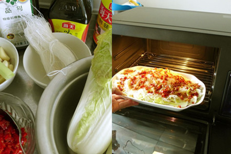 剁椒白菜粉丝。这道菜简单好学,容易上手。将白菜和粉丝洗干净,粉丝需要提前浸泡。大蒜切碎并放入锅中爆香,再加入剁椒一同炒制。将准备好的蒜泥剁椒浇在白菜粉丝上,然后将整道菜放入烤箱,一般烤7分钟就可以了。