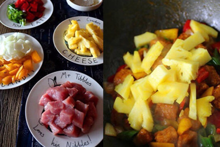 花生爆香以后,加入里脊肉,炒到稍微变色。再加入甜椒一同翻炒,如果喜欢爽脆口感的甜椒,可以晚一点炒。加入菠萝一同炖煮,并且加入配置好的酱料。有些地方喜欢用番茄酱,有些则喜欢用甜辣酱,根据自己喜好就可以了。