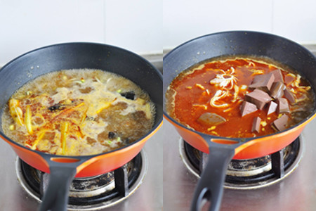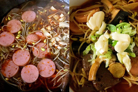制作步骤:首先把鸭血切块,木耳提前泡发好,火腿切片,生姜切丝,蒜蓉和香葱切碎备用。接着热锅倒油,先放生姜和蒜蓉爆香,再放入辣椒油和豆瓣酱,加盐和酱油调味。然后另外煮一锅开水,依次放入豆芽、木耳焯熟,捞出装盘待用。再放入鸭血、火腿、牛肚和牛百叶煮3分钟,捞出和豆芽、木耳装在一起,倒入汤汁,即可享用。