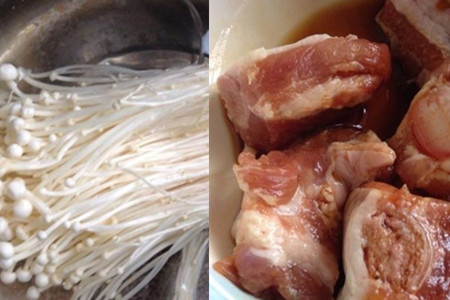 金针菇去掉老根,掰成小块,洗干净备用。肋排洗干净切成小方块,装入碗里,加入适量酱油、料酒,用手拌匀,腌制十五分钟。肋排腌好之后,撒入适量红薯粉,拌匀,让肋排表面黏上红薯粉,尽量黏得均匀点。