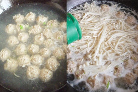 炒锅上灶,开火烧热,注入适量食用油,放入葱片和姜丝煸炒,炒出香味后,加入适量清水。待锅里的汤水煮开后,取适量肉馅揉成大小合适的丸子,放入汤锅里,把所有肉馅依次做成丸子下锅。待丸子煮到浮起来时,放入洗干净的金针菇,调入适量食盐、胡椒粉和鸡精,撒上香菜末,烹入适量香油,等金针菇煮熟就可以关火了。