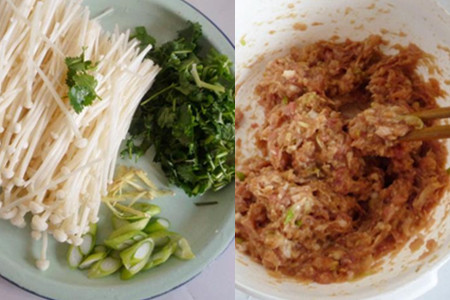 食材:金针菇250克、猪肉馅300克、鸡蛋清、大葱、姜、胡椒粉、食盐、香油、香菜、料酒、酱油、食用油。
