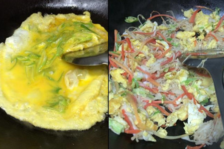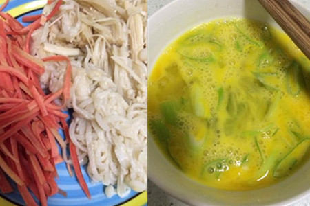 食材:金针菇500克、鸡蛋150克、胡萝卜、大葱、生抽、盐、油。