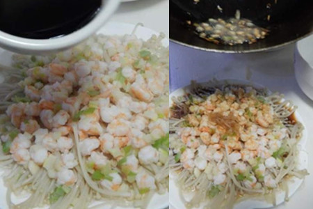 蒸好之后,取适量蒸鱼汁和生抽调成料汁,淋在金针菇上。炒锅上灶,注入适量食用油,开中火加热,油温升高后,下大蒜末煸炒,炒出香味后,把热油和蒜末浇在蒸熟的金针菇上,吃的时候拌匀即可。【女物原创未经允许,谢绝转载!】