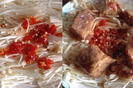 取一个干净的盘子,摆上滤干水分的金针菇,舀两勺剁椒倒在金针菇上,再摆上腌好的肋排。蒸锅上灶,注入适量清水,开大火煮沸后,放入装有金针菇和排骨的盘子,加盖蒸二十分钟即可关火,关火后焖几分钟再打开盖子。如果家里没有红薯粉,可以用其他淀粉代替,不过红薯粉比较香。