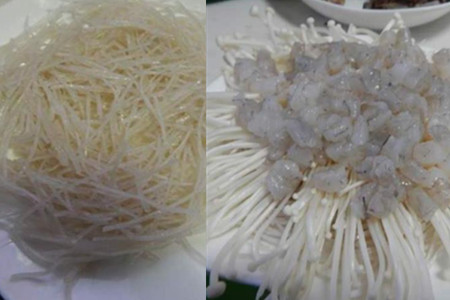 食材:金针菇100克、粉丝80克、虾仁120克、蒸鱼豆豉、蒜、生抽、盐、油。