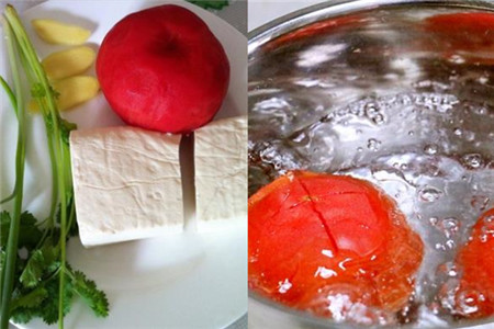 先准备好材料,主材料为两三个新鲜番茄,一块豆腐,配料为一根葱,还有适量的蒜瓣、盐、鸡精。把番茄洗干净然后,放水进锅中烧开,在把番茄放进开水中滚烫一下,然后再拿出来。这时烫好的番茄就会很容易去皮,去掉皮后就把番茄切成小块。把准备好的大豆腐,切成小块备用。再把葱蒜清洗干净放入水中洗干净,再切成葱段蒜粒,备用。