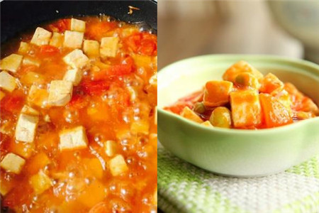 番茄豆腐既有番茄的酸甜味道,又有豆腐的鲜嫩细腻口感,番茄汁渗入到豆腐中,使豆腐更加美味,口感更加独特。这道菜不仅做起来非常简单,其内含的营养物质更加丰富,能减肥美容,降低血脂的功效。而以这两种主材料做成的美食还有其他的做法,这会因不同地区的习俗,以及人们的生活烹饪习惯不同,还有所用配料的不同,导致做出来菜肴也会有差异。