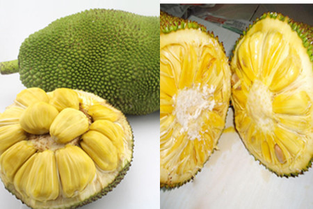 而菠萝蜜的果肉比较光滑,是黄色或者橙色,鸡蛋的大小,数量要比榴莲多很多,大一点的菠萝蜜的数量达到50-60块。再来就是从气味上区分了,榴莲的气味会很臭,但是会闻久了,就会觉得很香。菠萝蜜是香味与榴莲大有不同,它的香味是很香的。所以才有人喜欢吃菠萝蜜不喜欢吃榴莲。