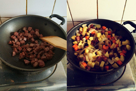 制作步骤:首先把牛肉洗净切粒,土豆和红萝卜削皮切小块,洋葱切条,杏鲍菇切块,香菜切段备用。接着热锅倒油,放入牛肉翻炒至变色后,装盘待用。然后再次热锅倒油,倒入土豆、红萝卜、洋葱和杏鲍菇翻炒,加少量酱油调味。待土豆变软后,倒入牛肉和咖喱,加适量的清水炖煮。十分钟后,撒上香菜,即可熄火,尽情享用美食吧。