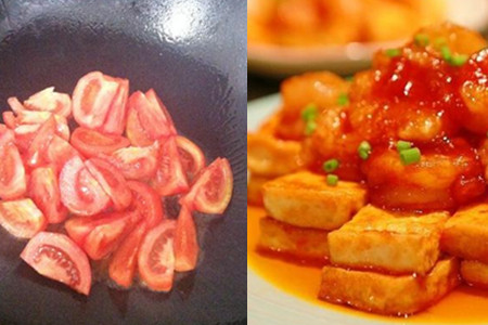 第四步,制作番茄豆腐虾仁。锅中倒入一点油,开大火,将切好的番茄粒倒入锅中,大火翻炒,撒上适量的食盐,加上一点水,继续翻炒,直到锅中的番茄炒成番茄汁,这时将煎好的豆腐和虾仁倒入锅中,撒上胡椒粉和适量的鸡精调味,大火翻炒均匀后就可以关火了。