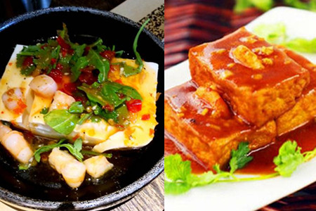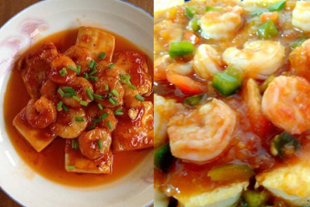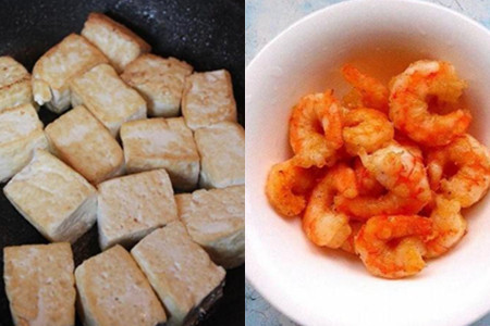 煎豆腐和虾仁的时候要注意火候,不能将它们煎糊了,将表面煎黄是理想状态,当然只要煎熟了就可以了。