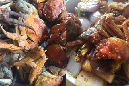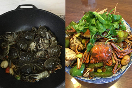 制作步骤:首先用牙刷把大闸蟹仔细清洗干净,豌豆取粒,青椒、米椒和香菜切段,生姜切片,蒜蓉拍扁备用。接着热锅倒油,放入蒜蓉、生姜、花椒、青椒和米椒爆香一下,再倒入大闸蟹翻炒。待大闸蟹变成红色的时候,加入适量的清水,再倒入豌豆一起炒,加盐、料酒和酱油调味。翻炒十分钟左右,即可装盘,再撒上香菜就大功告成了。