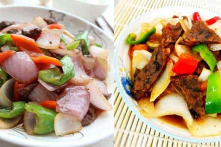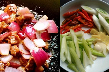 卤好的牛肉放凉了之后切成片备用。洋葱去掉外面的干皮,清洗干净之后切成块儿备用。小葱洗净之后切成葱花备用,红辣椒清洗干净之后去掉籽和蒂切成块儿备用,生姜清洗干净去掉皮切成丝备用,大蒜切成片备用,干辣椒切成段备用。接着锅里加入适量的油,等油烧到八分热的时候加入卤好的牛肉块,然后加入适量的盐快速的翻炒然后盛出来备用。