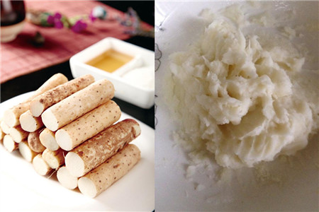第二,山药泥。让我们把山药洗一下,然后用蒸锅蒸。水煮山药含有大量水分,会严重影响后续产品的生产。蒸山药被压在碗里,撒上一些花生碎片,加一点香油和盐就是一道简单美味的美食了。喜欢甜的也可以加蜂蜜。
