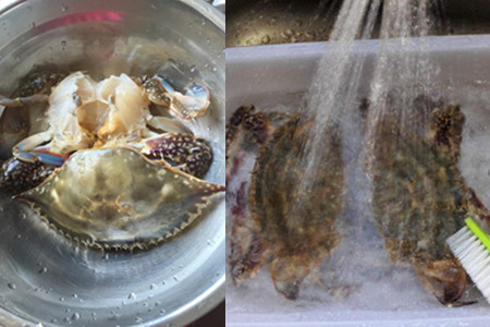 第一步,材料准备阶段。我们需要的材料是一个盆子还有洗刷用的刷子,足够的清水还有白酒。白酒不需要那么多,我们用清水稀释白酒,一同倒入盆中,只要盆中混合液体的高度可以没过买来的梭子蟹即可。之后便要把买来的梭子蟹一起放入盆中,要保证每一只梭子蟹都被泡在液体中,并且不能让它爬出盆子,盖上一个盖子是个不错的选择。