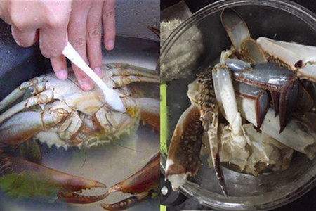 第四步,清洗梭子蟹的蟹钳。这一步单另拿出来是因为梭子蟹的钳子周围可能会有许许多多的毛,许多脏东西被包含在里面,所以在清洗梭子蟹的时候需要特别注意这个部位,当这些步骤都做完了,我们的梭子蟹也就被处理好了。【女物原创未经允许,谢绝转载!】