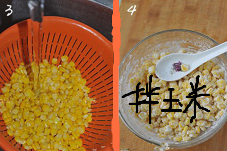 第二步,拌玉米。将玉米粒放在筛网中,用清水冲洗玉米粒,抖一抖筛网后倒进一个盆中,加入适量的淀粉搅拌均匀,尽量让每颗玉米粒的表面都有淀粉。