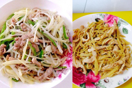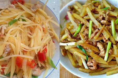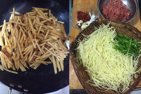 土豆丝炒熟之后,就可以把肉丝放进去一起翻炒,再加入盐、醋等调料提味。