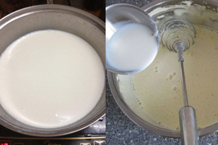 下面就是混合牛奶和打好的鸡蛋了,混合之后搅拌均匀,之后回锅中继续重复加热的步骤,再次去除一些水分,也更刺激香味的散发。当锅中的混合液体差不多被煮的快要沸腾时就可以关火了,等到冷却之后就可以倒入容器,放入冰箱中冷冻了。