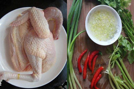 第一步:准备食材。主要食材有新鲜土鸡半只,辅助食材有炒花生米适量,葱一小棵,生姜一小块,香菜一棵,蒜头两瓣,花椒适量,香油,白糖,生抽,盐,醋,味精,料酒,辣椒粉。