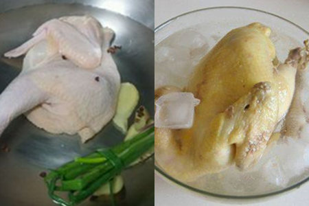 第四步:将焯水的鸡肉迅速放入冰块中降温,使得鸡肉变得紧致爽滑。