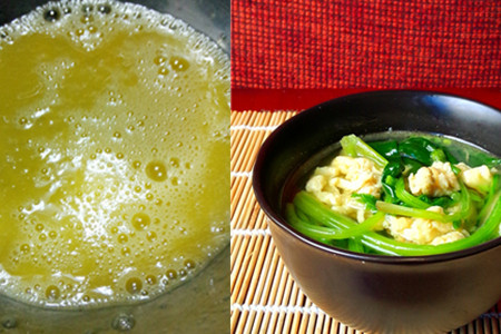 菠菜鸡蛋汤,将鸡蛋打散并加入一些咸盐调味。菠菜用水稍微焯一下,这样做可以破坏菠菜中的有害成分。将菠菜放入水中煮熟,然后加入打散的鸡蛋液。稍微搅拌一下,再加入调味料进行调味即可,还可以在汤中滴两滴香油。