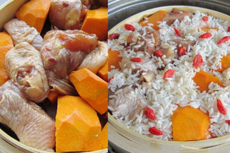 粽叶洗干净铺在蒸笼里,把腌好的鸡腿块铺在蒸笼底部,再铺上南瓜,然后铺上糯米,淋上腌制鸡块的料汁,撒上枸杞,冷水下蒸锅,开大火烧开后蒸十分钟,再调至小火蒸二十分钟。蒸熟之后,取出,拌匀即可食用。