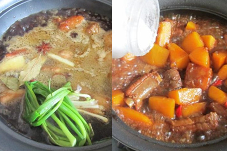 然后取一口砂锅,排骨转入砂锅里,烹入适量红烧汁和料酒,加足量清水没过排骨,放入八角、桂皮、红辣椒和葱结,加盖,开大火煮沸后调至小火炖十五分钟。十五分钟后,将南瓜削皮切块下锅,再盖上盖,继续炖五分钟。五分钟后,揭开盖子,撒入适量胡椒粉和盐,调至大火,把砂锅里的汤汁收到自己喜欢的程度即可。