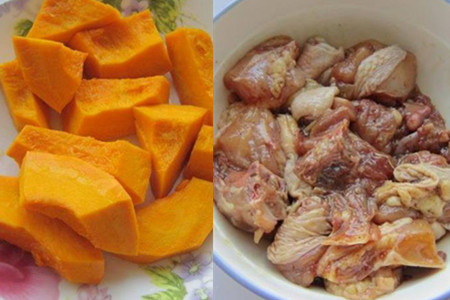 糯米用清水淘洗几次,再用清水泡上两个小时。南瓜削皮,挖掉南瓜籽,切成大块。鸡腿洗干净斩成小块,装入大碗里,加适量胡椒粉、花椒粉、料酒、姜片、盐和生抽,用手拌匀,腌制半小时左右。