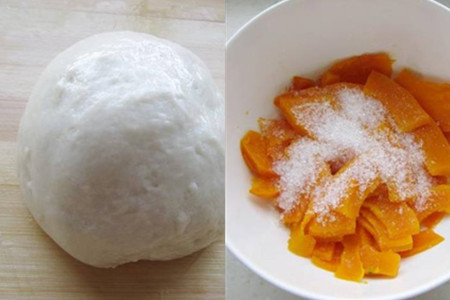 往面粉中加入适量开水,搅拌均匀。双手抹上植物油,把面粉揉成面团,尽量把表面揉光滑一些,然后用保鲜膜包好,让面团静置二十分钟以上。南瓜削皮切成薄片,装入碗里,放入微波炉里加热七八分钟。加热好之后,取出,往南瓜里加入适量白砂糖,用勺子搅拌均匀并且捣成泥状。
