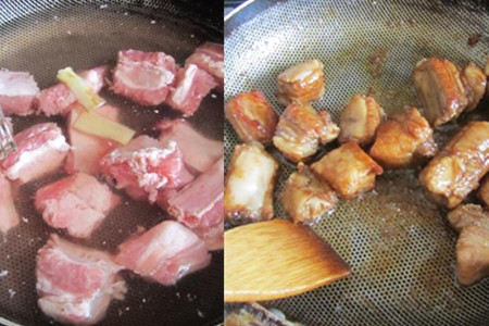 先将排骨清洗干净,剁成小块,放入干净的锅里,注入冷水没过排骨,加几片姜片,烹入适量料酒,开大火煮沸,捞出锅,开水龙头的水冲洗一下,滤干水分备用。炒锅上灶,注入少许食用油,烧热,下冰糖炒制,冰糖溶化并且变成棕色后,放入烫过的排骨,一起翻炒,使得糖色完全裹在排骨上。