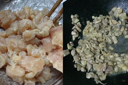 第三步,炒肉丁。将锅清洗干净并擦干水分,大火烧热以后加入适量的清油,将腌制好的鸡肉丁倒入锅中,用锅铲迅速翻炒,炒制鸡肉丁变色大概8分熟的时候,将火关掉,往锅中撒入一点胡椒粉,搅拌均匀后将鸡肉丁盛在小碗中备用。
