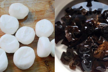 很多地方为了荸荠好看会将它洗干净再卖,这时候要注意捏一下荸荠,如果荸荠一捏会冒出很多水,这样的荸荠也不要购买,里面的肉质已经不新鲜了。木耳选择干燥的黑木耳,叶片稍大一点,颜色稍微深一点的比较好。香菜选择嫩一点的就可以,不用太多。