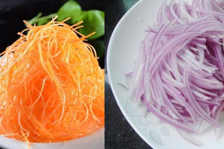 首先小编要给大家介绍的是凉拌洋葱的具体做法。我们需要准备的原材料有洋葱、胡萝卜、尖椒、小葱、生姜、大蒜、香油、盐、白砂糖、醋、小米椒。洋葱清洗干净之后切成丝备用,胡萝卜洗净之后去掉皮也切成丝备用。尖椒洗净之后去掉籽,切成丝备用。葱切成葱花,生姜和大蒜切成末备用,小米椒切成段备用。