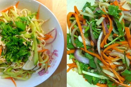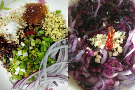 所有的原材料都准备齐全了之后,将它们放在一个大的容器里。因为大的容器比较好拌一些,在拌的过程中菜也不会掉出来。菜都放进容器里了之后,接着我们就将盐撒在上面腌制十分钟。腌制好了之后用手挤掉里面的水,然后再加入蒜末、姜末、白砂糖、醋、香油、葱花、小米椒。搅拌均匀了之后即可装盘食用了。喜欢吃清淡口味的朋友们可以不用加小米椒。