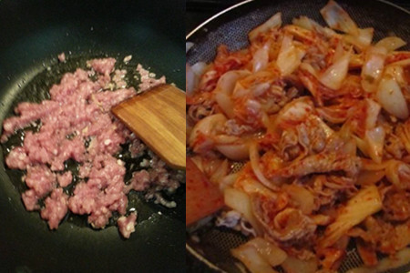 如果我们想要加入类似肉末的肉类食物,就需要先对其进行加工,比如猪肉就必须先将猪油煸炒出来,散发香气,其他肉类也是如此,需要先行炒制。之后就是加入辣白菜和其他材料一同进行炒制了,这样辣白菜和肉末的味道混合得更加充分,对于之后加入米饭的炒制帮助很大。不过请大家切记炒制过程中不要放盐,泡菜盐分已经足够了。