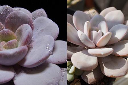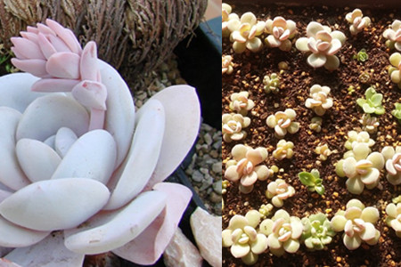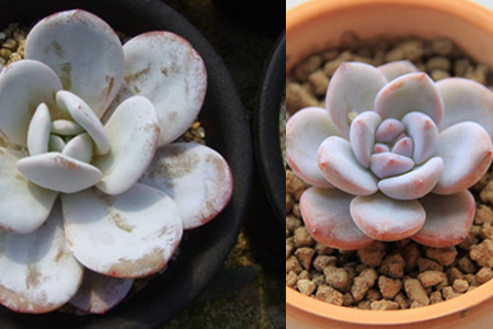 这种植物的叶子看起来非常的可爱,又圆又厚,它的叶子也比较的大,一棵成株的叶子可以长到八厘米那么大。这种植物的叶子颜色为偏灰的绿色,但是我们看到的却都是有点粉,又有点白的颜色,这是因为它的叶子表面上长满了一层厚厚的粉状物质,这一层粉完全遮掩住了其叶子原来的颜色,使植物看起来仙气十足,大大提高了它的颜值。