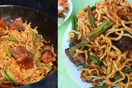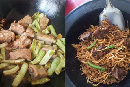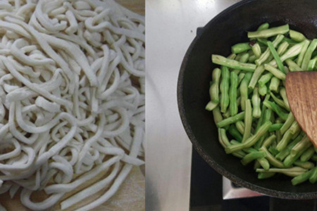 然后放入排骨,倒入一些料酒、生抽。翻炒五分钟左右把豆角都放进去,大火翻炒,加入精盐、鸡精等调味品,继续翻炒。等到豆角熟了五分左右,就可以把面条放进去,要少量多次放进去,否则,面条很容易黏在一起。这个时候,就需要往锅里加清水了,因为面条上带着少量的干面粉,干面粉特别吸水。