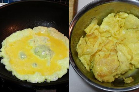第三步,煎鸡蛋。将锅清洗干净并擦干里面的水分,开大火将锅烧热,倒入适量的食用油,将打发好的蛋液倒入锅中,晃动一下锅让蛋液平整的铺在锅底,转中小火煎一下鸡蛋,一面煎好以后用锅铲将鸡蛋翻个面继续煎,两面都煎成金黄色后关火,用锅铲将鸡蛋饼斩成大小适宜的块状,盛入碗中。