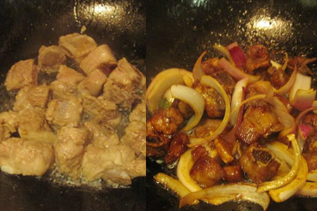 取一个干净的炒锅,置于灶上,开中火预热,注入适量食用油,洋葱洗净切成块下锅,煸炒两分钟。接着将腌好的猪肝下锅,一起翻炒。待猪肝炒变色后,调入适量食盐、椒盐和清水,翻炒均匀。猪肝完全炒熟之后,再调入适量白糖,炒匀即可。