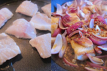 取一个口平底锅,置于灶上,开火预热,倒入少许橄榄油晃匀,将裹上生粉的鱼块下锅煎制。鱼块两面煎成微微发黄后,拨到一边,放入切好的洋葱,搅拌均匀。接着淋入调好的蒜香汁,加盖,焖煮片刻就可以关火了。龙利鱼很容易熟,所以不要煎太久,否则肉质会变老,影响口感。