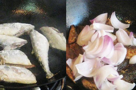 取一口干净的炒锅,置于灶上,注入适量食用油,开火烧热,将裹上干淀粉的秋刀鱼下锅煎制。秋刀鱼双面都煎成焦黄色时,放入辣椒、姜和葱,翻炒片刻。接着烹入适量料酒、生抽、白糖和少许清水,调至中火煮十分钟。十分钟后,将切好的洋葱下锅,调入适量食盐,炒匀后煮两三分钟,然后加入一些葱花即可关火。