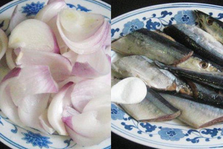 洋葱洗干净切成片。秋刀鱼去掉鱼鳃和内脏,清洗干净,切成段,装入盘中,撒上适量食盐和料酒,用手抹匀,腌制二十分钟。腌好之后,倒掉腌秋刀鱼的料汁,撒上一些干淀粉,用手拌匀待用。