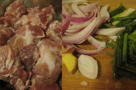 排骨剁成小块,洗干净后沥干水分。洋葱洗干净切细条,生姜洗净切成片,大葱洗净切成寸段。